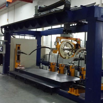 包帶頭安裝于移動(dòng)式龍門上,可在寬度方向(Y軸)及高度方向(Z軸)自動(dòng)移動(dòng)并隨龍門實(shí)現(xiàn)長度方向(X軸)移動(dòng)??倷C(jī)由六個(gè)控制軸聯(lián)動(dòng)控制以實(shí)現(xiàn)對三維線棒的最佳絕緣包帶。包帶頭進(jìn)行了平衡設(shè)計(jì)以保證高速包帶時(shí)的穩(wěn)定性,可實(shí)現(xiàn)1盤包帶或2盤包帶,包帶張力可根據(jù)需要設(shè)定并實(shí)現(xiàn)恒張力。